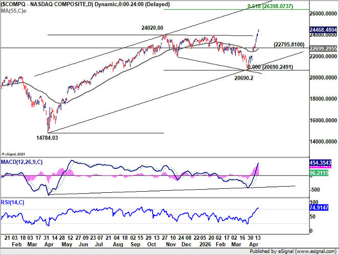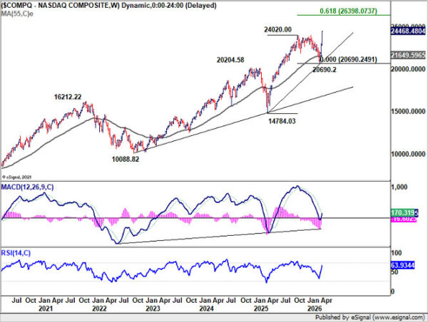 NASDAQ shows a similar structure, ending the week at a new record of 24,468.48. Near-term outlook remains bullish as long as 22,795.81 support holds, even in the event of a retreat. The broader uptrend targets 61.8% projection of 14,784.03 to 24,020.00 from 20,690.2 at 26,398.07 next.
