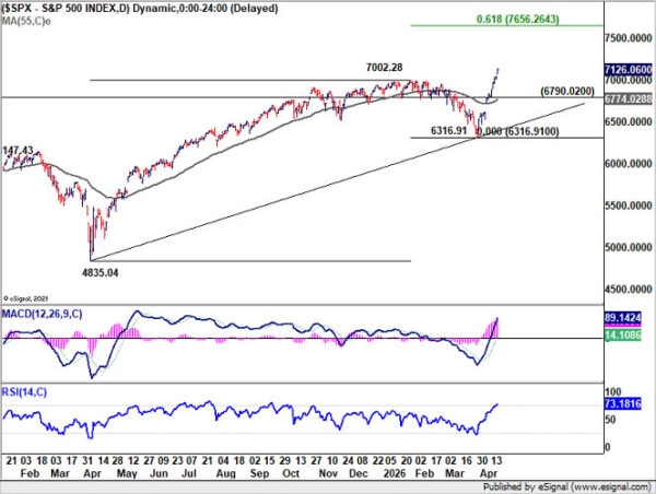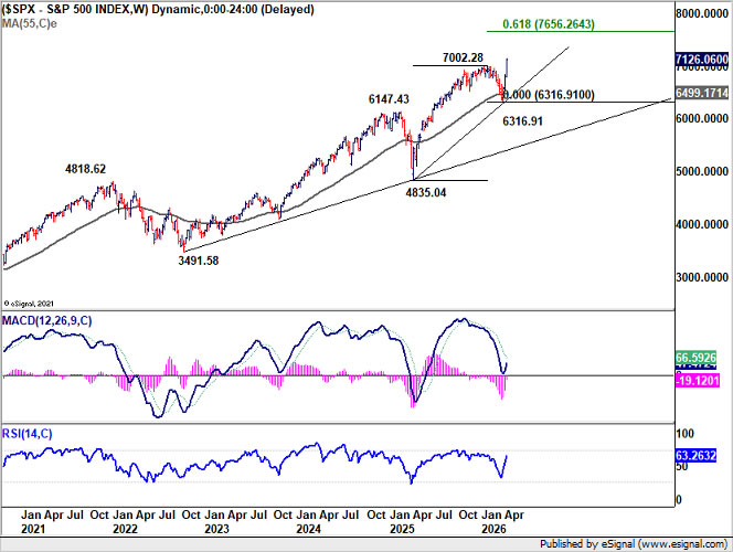 S&P 500 resumed its uptrend last week, breaking above 7,002.28 resistance and closing at a fresh record high of 7,126.06. While near-term volatility or a pullback cannot be ruled out given geopolitical uncertainty, the outlook remains bullish as long as 6,790.02 support holds. The current advance continues to target 61.8% projection of 4,835.04 to 7,002.28 from 6,316.91 at 7,656.26.