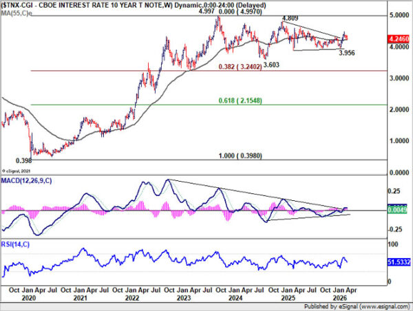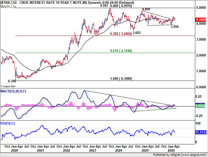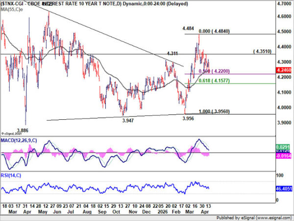 US 10-year yield’s pullback from the 4.484 short-term top remains corrective so far, suggesting that the rise from 3.956 is not yet complete. Yields are now testing a key support cluster, including 55 D EMA (now at 4.240), 50% retracement of 3.956 to 4.484 at 4.220, and 55 W EMA (now at 4.219).