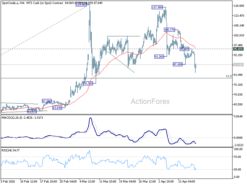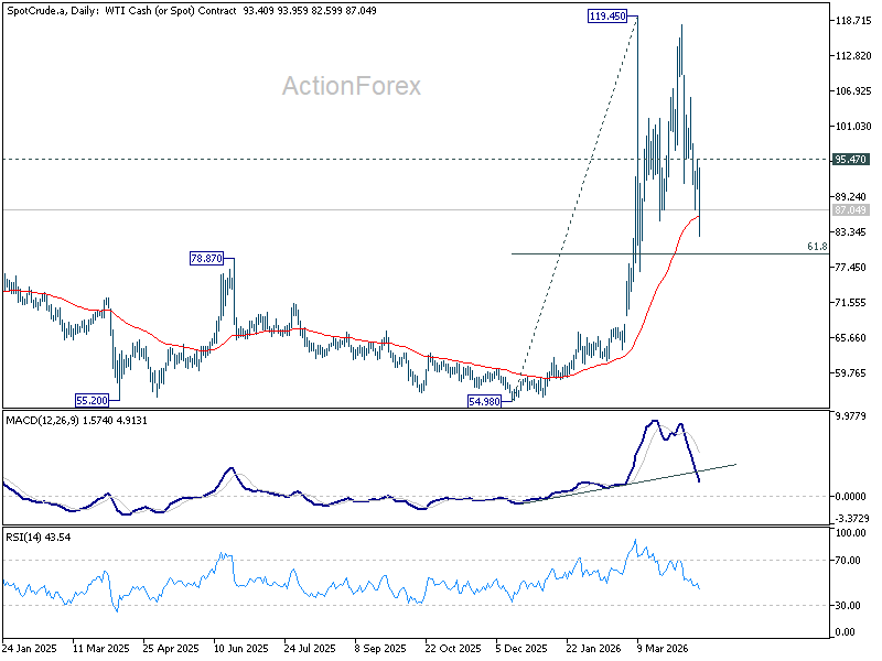 Oil remains the most important driver of global market sentiment. WTI’s decline from 117.90 resumed last week, extending sharply lower to as low as 82.59. While further downside is favored in the near term, a decisive break of the 61.8% retracement of 54.98 to 119.45 at 79.60 would likely require a more durable de-escalation in the Middle East—potentially including a confirmed and sustained normalization of the Strait of Hormuz. Absent that, the psychological 80 level should act as a near-term floor.