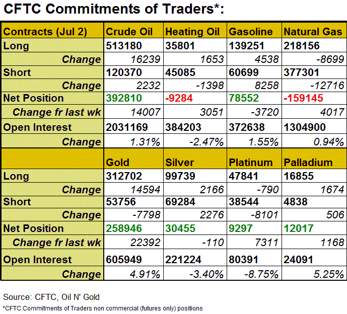 According to the CFTC Commitments of Traders report for the week ended July 2, NET LENGTH for crude oil futures rose +14 007 contracts to 392 810 for the week. Speculative long positions jumped +16 239 contracts and shorts added +2 232 contracts. Crude oil prices continued recently ahead of OPEC+ meeting. Prices retreated after the deal to extend output cut towards 1Q19. For refined oil products, NET LENGTH for gasoline fell -3 720 contracts to 78 552, while NET SHORT for heating oil dropped -3 051 contracts to 9 284 for the week. NET SHORT for natural gas futures dropped -4 017 contracts to 159 145 contracts for the week.