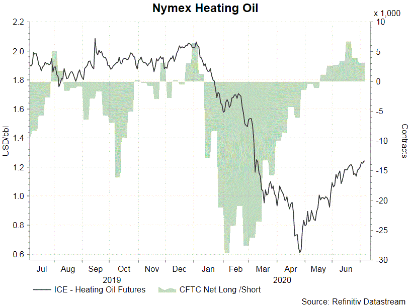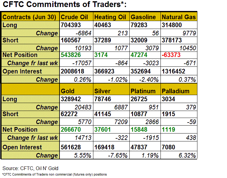 According to the CFTC Commitments of Traders report for the week ended June 30, NET LENGTH for crude oil futures plunged -17 057 contracts to 543 826 for the week. Speculative long positions dropped -6 864 contracts while shorts rose +10 193 contracts. For refined oil products, NET LENGTH for gasoline declined -3 023 contracts to 47 274, while NET LENGTH for heating oil futures dropped -864 contracts to 3 174. NET SHORT for natural gas futures added +671 contracts to 63 373 contracts for the week.