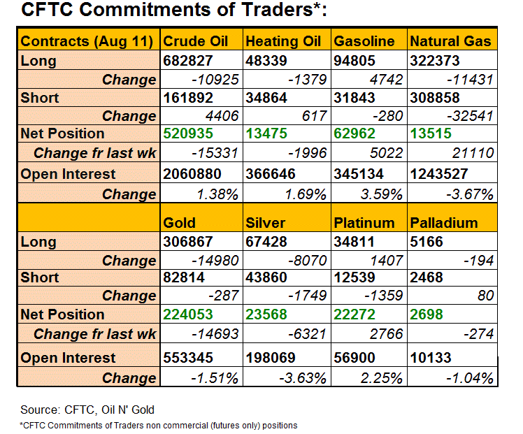 According to the CFTC Commitments of Traders report for the week ended August 11, NET LENGTH for crude oil futures plunged -15 331 contracts to 520 935 for the week. Speculative long position declined -10 925 contracts, while shorts added +4 406. For refined oil products, NET LENGTH for gasoline increased +5 022 contracts to 62 962, while NET LENGTH for heating oil futures dropped -1 996 contracts to 13 475. Natural Gas drifted to NET LENGTH of 13 515 contracts for the week.