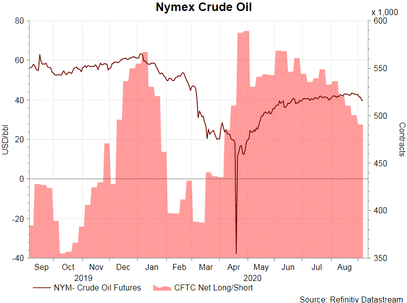 According to the CFTC Commitments of Traders report for the week ended September 1, NET LENGTH for crude oil futures declined further, by -9 784 contracts to, 490 915 for the week. Speculative long position fell -6 429 contracts, but shorts rose +3 355 contracts. NET Length is expected to shrink further with selloff of crude oil oil over the past week. Losing over -6% last week, the front-month WTI and Brent contracts had their worst decline since mid-June. For refined oil products, NET LENGTH for gasoline increased +1 349 contracts to 72 423, while NET LENGTH for heating oil futures declined -4 765 contracts to 10 540. NET LENGTH in Natural Gas futures more than doubled, jumping +18 048 contracts, to 31 686 for the week.