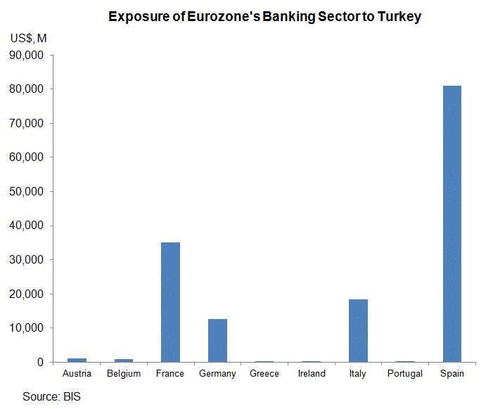 Euro’s weakness late last week was driven by a Financial Times report suggesting that ECB has become concerned about the exposure of some of Eurozone’s banks to Turkey, in particular BBVA, UniCredit and BNP Paribas. The news has sparked concerns over contagion of Turkey’s problems to other European countries, especially those in the perphery. Some have gone so far to suggest that European sovereign debt crisis in 2009/10 can return. Turkish central bank (TCMB).