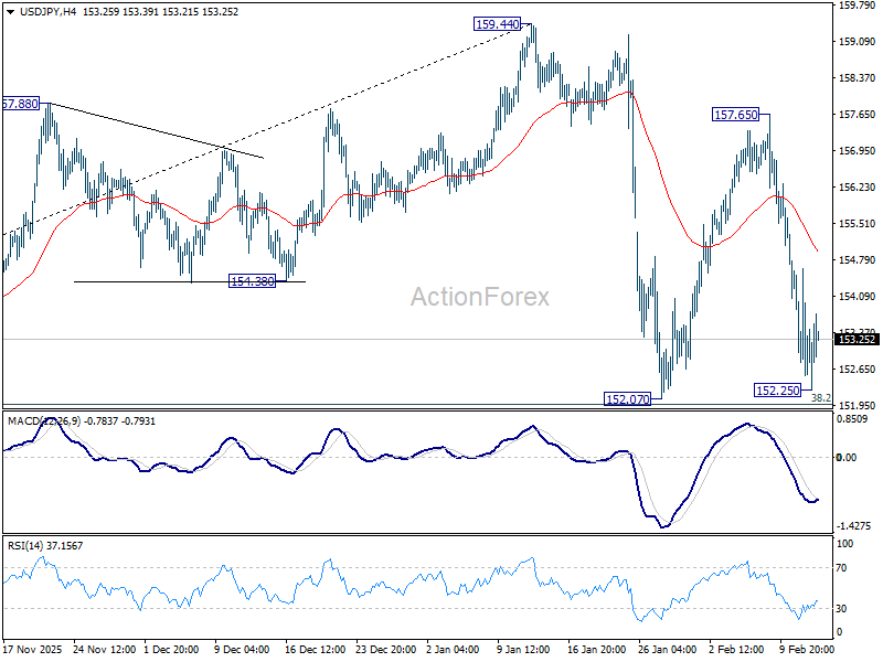 No change in USD/JPY's outlook and intraday bias remains neutral. While another fall cannot be ruled out, strong support should be seen from 38.2% retracement of 139.87 to 159.44 at 151.96 to bring rebound. On the upside, sustained break of 55 4H EMA (now at 154.96) will bring stronger rebound towards 157.65. However, sustained break of 151.96 will argue that it's reversing the rise from 139.87 already.