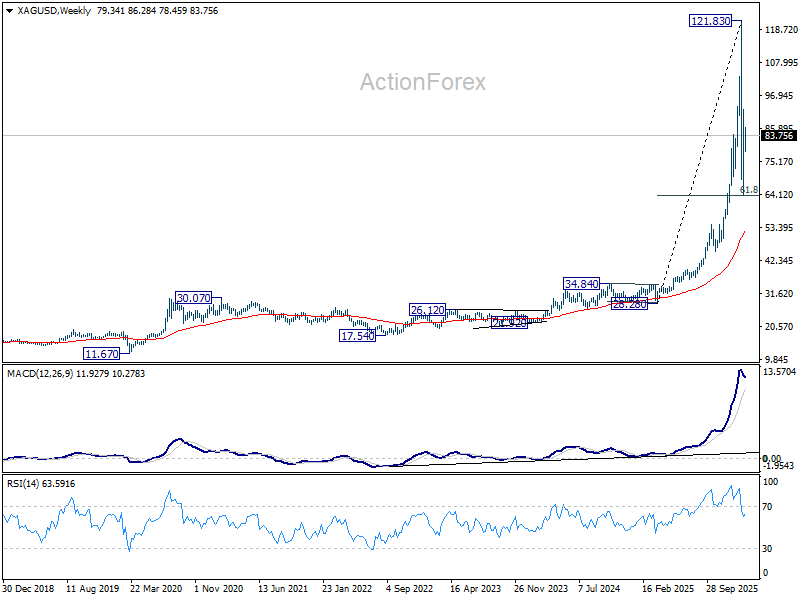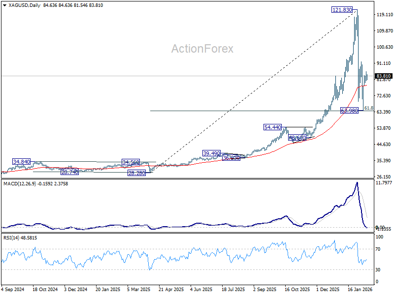 If Silver can sustain trading above the 85/86 zone, it would solidify the case that the first corrective leg completed at 63.98 and that a second leg higher is underway. In that scenario, further rise should be seen to 61.8% retracement of 121.83 to 63.98 at 99.73. However, the psychological 100 level sits just above that target and is likely to cap upside.