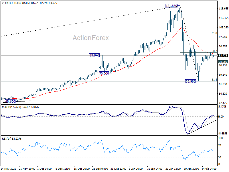 Silver is now pressing into a critical near-term resistance cluster around 85–86, a zone that could determine whether the sharp selloff from 121.82 has already bottomed at 63.98 or whether another leg lower is still ahead. The area combines 55 4H EMA (now at 85.27) and 38.2% retracement of 121.83 to 63.98 at 86.07, creating a technically dense barrier. Price reaction here is likely to set the tone for the next multi-week move.