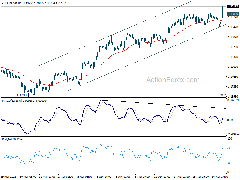 EUR/USD’s rally resumes in early European session and it finally takes out 1.2 handle with some power. The solid support from 55 day EMA affirms near term bullishness. The development is also inline with out view that correction from 1.2348 has completed with three waves down to 1.1703. We’d now expect further rally back to 1.2242/2348 resistance zone.