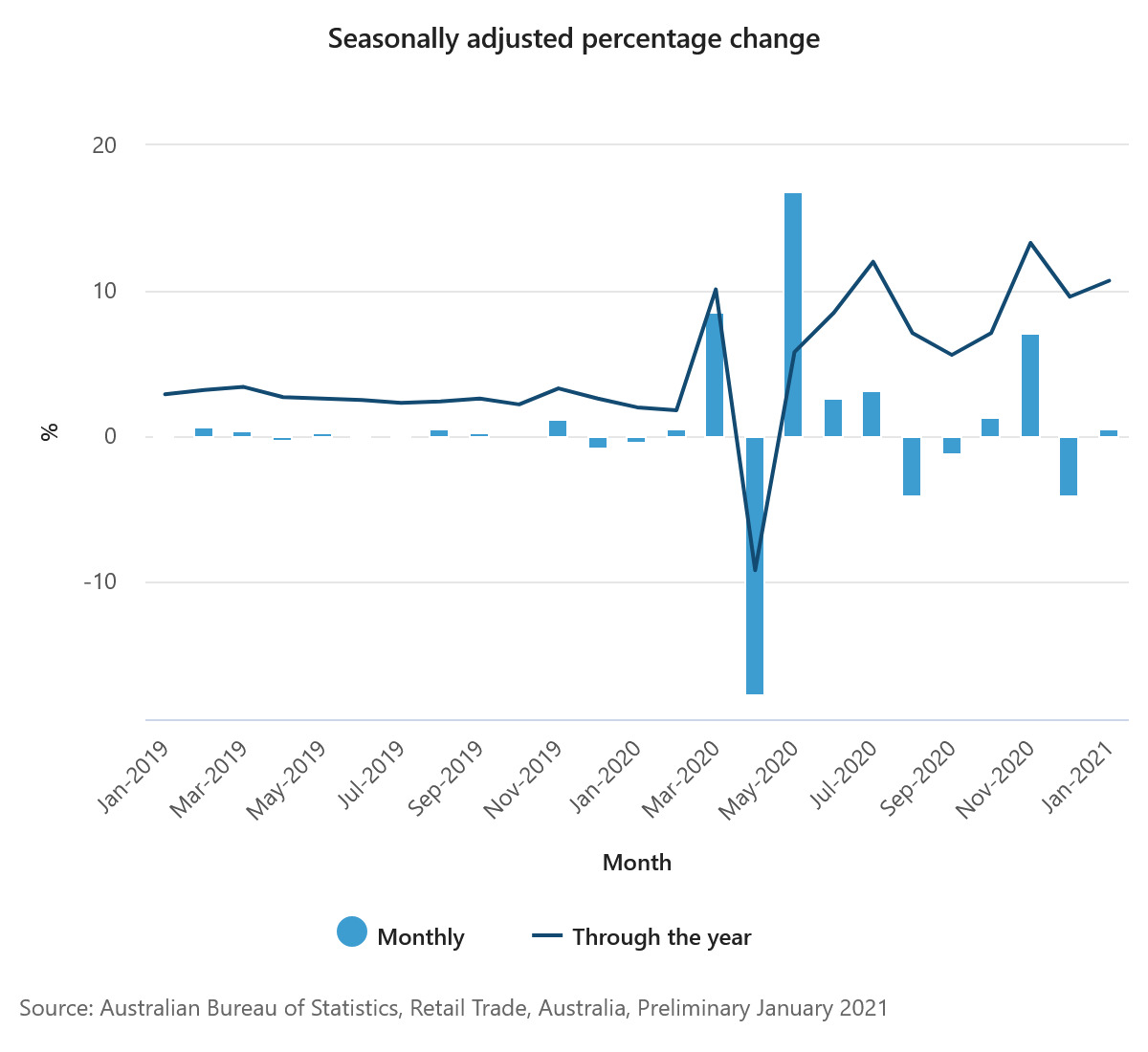 In the three months to January, retail sales dropped -4.9%, compared with the previous three months, with strong declines in both clothing stores and automotive fuel. Total sales volumes were at -5.5% below pre-pandemic level in February 2020.