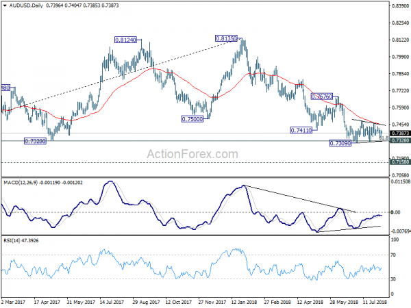 In the bigger picture, medium term rebound from 0.6826 (2016 low) is seen as a corrective move that should be completed at 0.8135. Sustained break of 0.7328 cluster support (61.8% retracement of 0.6826 to 0.8135 at 0.7326) should pave the way to retest 0.6826. There is prospect of resuming long term down trend from 1.1079 (2011 high). But we’ll look at downside momentum to assess at a later stage. On the upside, break of 0.7452 resistance might indicate medium term bottoming. But we’ll continue to favor the bearish view as long as 0.7676 resistance holds.