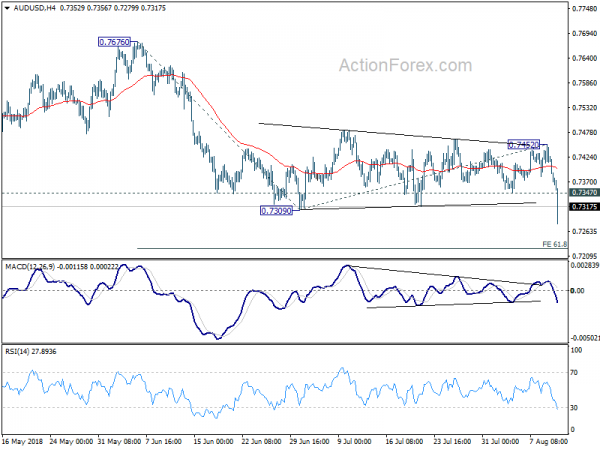 Intraday bias in AUD/USD remains on the downside with 0.7322 minor resistance intact. Current fall is part of the down trend from 0.8135 high. Deeper decline should be seen to 61.8% projection of 0.7676 to 0.7309 from 0.7452 at 0.7225 first. Break will target 100% projection at 0.7085 next. On the upside, above 0.7322 minor resistance will turn intraday bias and bring consolidation. But recovery should be limited below 0.7452 resistance to bring fall resumption.