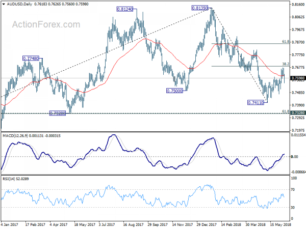 In the bigger picture, medium term rebound from 0.6826 (2016 low) is seen as a corrective move that should be completed at 0.8135. Deeper decline would be seen back to retest 0.6826 low. Firm break there will resume the long term down trend from 1.1079 and take 0.6008 support next (2008 low). This will now remain the favored case as long as 0.7676 resistance holds.
