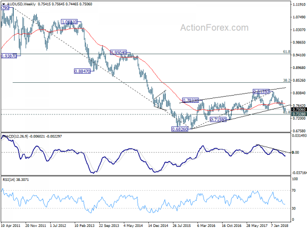 In the bigger picture, medium term rebound from 0.6826 is seen as a corrective move. Prior break of 0.7500 key support suggests that such correction is completed at 0.8135. Deeper decline would be seen back to retest 0.6826 low. In case of another rise, we’d expect strong resistance from 38.2% retracement of 1.1079 to 0.6826 at 0.8451 to limit upside to bring long term down trend resumption eventually.