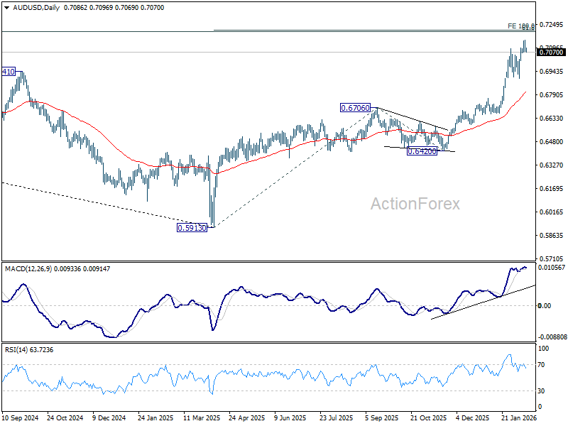 Intraday bias in AUD/USD remains on the upside for the moment. Current up trend should target 100% projection of 0.5913 to 0.6706 from 0.6420 at 0.7213. On the downside, below 0.7063 minor support will turn intraday bias neutral again. But retreat should be contained above 0.6896 support to bring another rally.