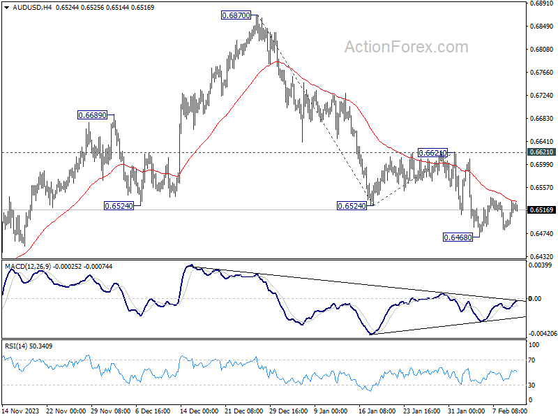 AUD/USD’s recovery from 0.6442 extends higher, but upside is still capped well below 0.6621 resistance. Intraday bias remains neutral and further decline is in favor. Below 0.6520 minor support will turn bias to the downside for retesting 0.6442 first. Firm break there will resume the the decline from 0.6870 towards 0.6269 low. Nevertheless, considering bullish convergence condition in 4H MACD, decisive break of 0.6621 will turn near term outlook bullish for 0.6870 resistance instead.