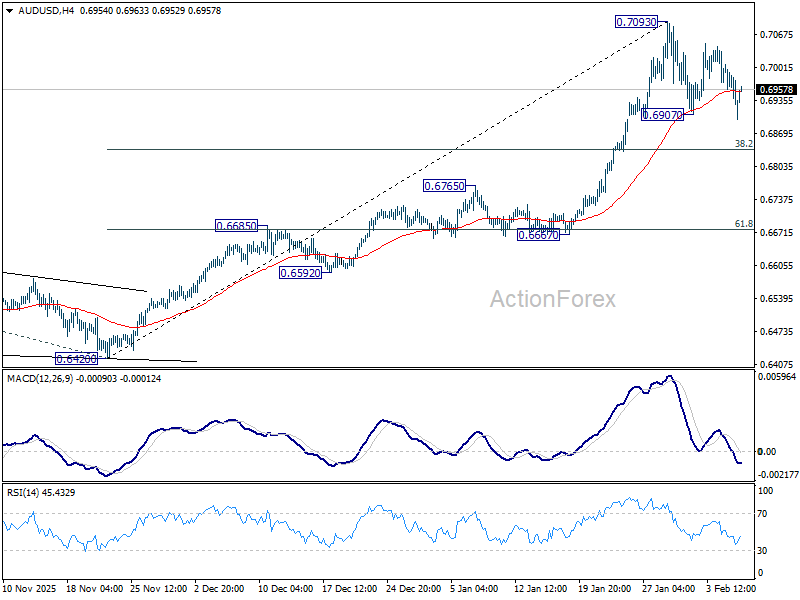 Intraday bias in AUD/USD remains neutral with focus on 0.7093 resistance. Decisive break there will resume larger up trend. Next target is 100% projection of 0.5913 to 0.6706 from 0.6420 at 0.7213. In case of another fall as the consolidation extends, downside should be contained by 38.2% retracement of 0.6420 to 0.7093 at 0.6836.