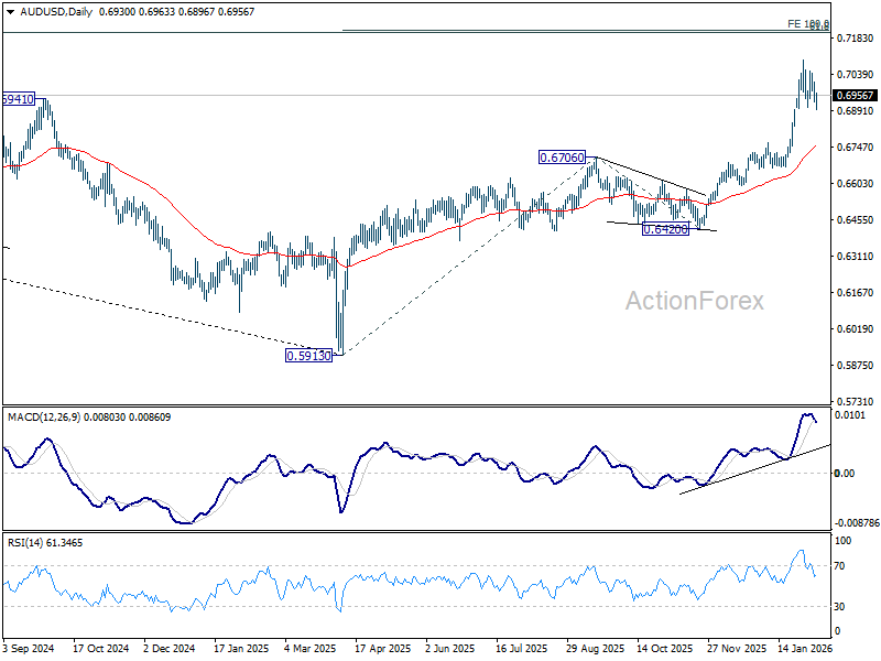 Intraday bias in AUD/USD remains on the upside for the moment. Current up trend should target 100% projection of 0.5913 to 0.6706 from 0.6420 at 0.7213. On the downside, below 0.7063 minor support will turn intraday bias neutral again. But retreat should be contained above 0.6896 support to bring another rally.