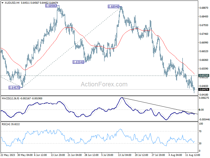 Intraday bias in AUD/USD stays mildly on the downside for the moment. Current decline is part of the whole fall from 0.7156, next target is 100% projection of 0.7156 to 0.6457 from 0.6894 at 0.6195. On the upside, break of 0.6520 resistance is needed to indicate short term bottoming. Otherwise, risk will stay on the downside in case of recovery.