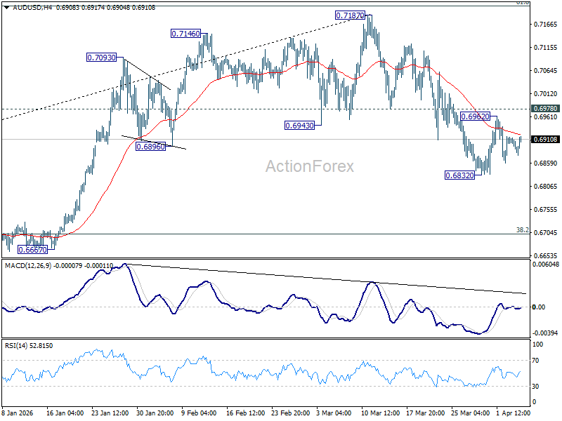 A temporary low should be in place at 0.6832 in AUD/USD with current recovery. Intraday bias is turned neutral first. Further decline is expected as long as 0.6978 support turned resistance. Below 0.6832 will extend the decline from 0.7187 to 38.2% retracement of 0.5913 to 0.7187 at 0.6700. However, firm break of 0.6978 will argue that the correction has completed, and bring retest of 0.7817 high.