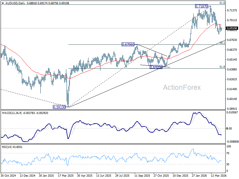 In the bigger picture, as long as 0.6706 cluster support holds, rise from 0.5913 (2024 low) should still be in progress. Decisive break of 61.8% retracement of 0.8006 to 0.5913 at 0.7206 will solidify the case that it's already reversing the down trend from 0.8006 (2021 high). However, firm break of 0.6706 will dampen this bullish case, and bring deeper fall back to 0.6420 support, and possibly below.