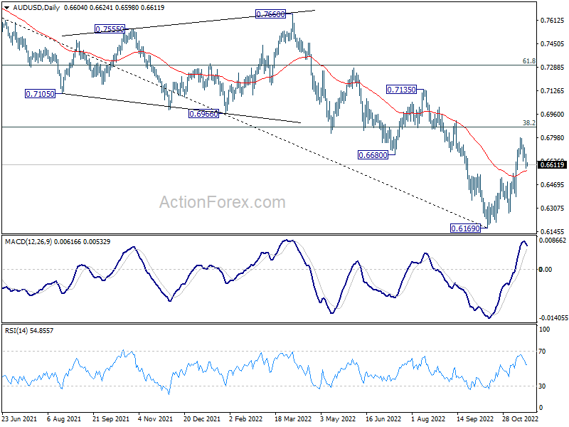 AUD/USD’s rally is resuming and intraday bias is back on the upside for 0.6871 fibonacci level. For now, outlook will remain bullish as long as 0.6641 support holds, in case of retreat. However, break of 0.6641 will indicate rejection by 0.6871 and turn bias back to the downside instead.
