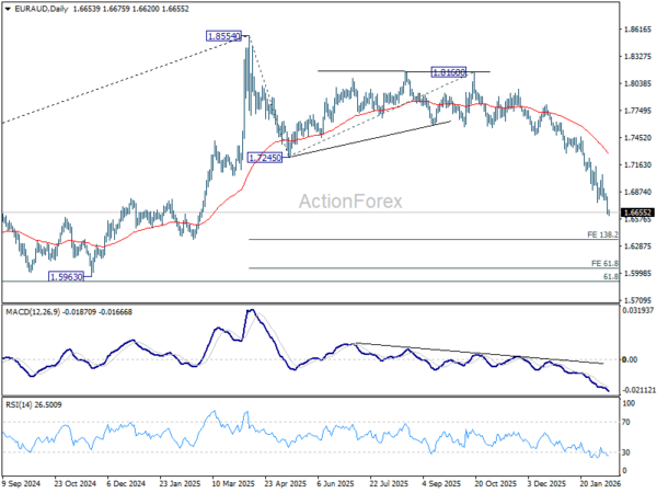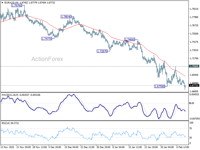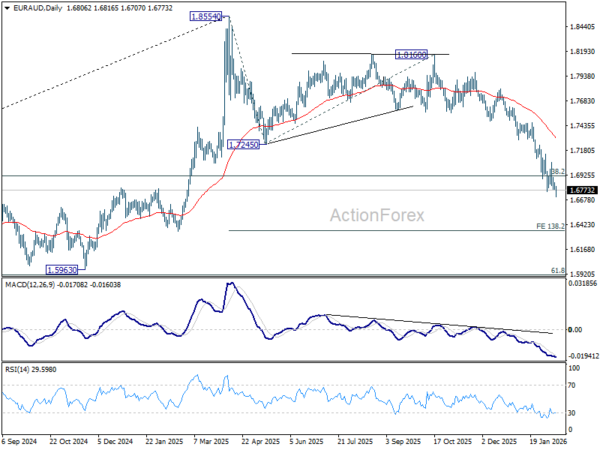 EUR/AUD's fall is resuming by breaking 1.6759 support. Intraday bias is back on the downside. Next target is 138.2% projection of 1.8554 to 1.7245 from 1.8160 at 1.6351. On the upside, however, break of 1.7060 resistance will indicate short term bottoming, and turn bias back to the upside for stronger rebound.