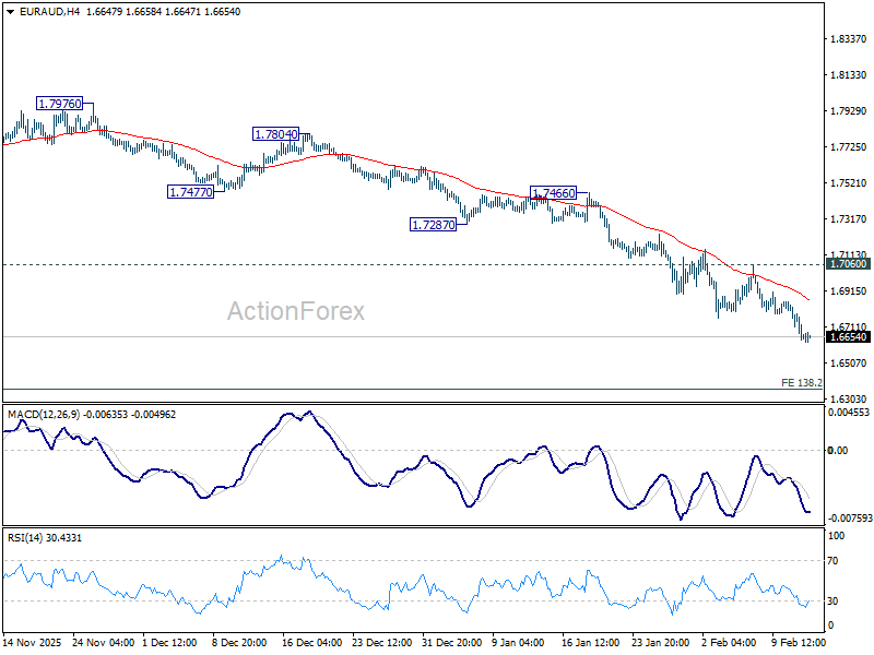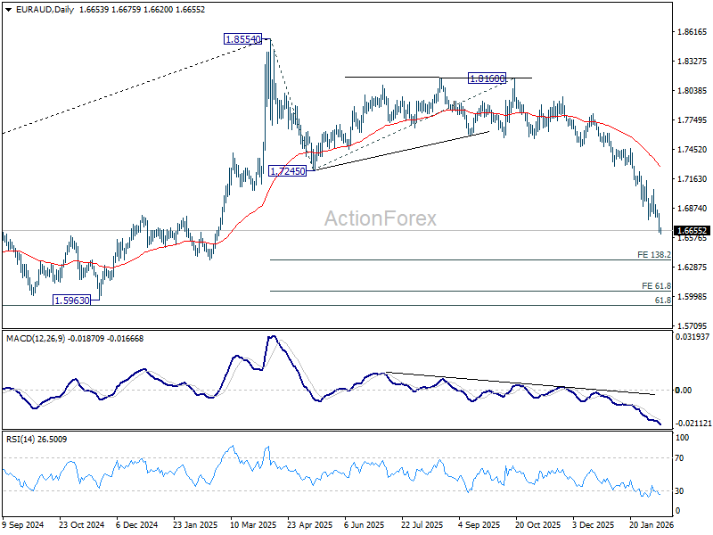 Intraday bias in EUR/AUD remains on the downside for the moment. Current fall is part of the whole down trend from 1.8554 and should target 138.2% projection of 1.8554 to 1.7245 from 1.8160 at 1.6351 next. For now, outlook will stay bearish as long as 1.7060 resistance holds, in case of recovery.