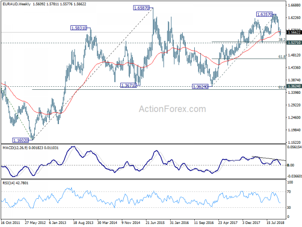 In the bigger picture, current development argues that up trend from 1.3624 (2017 low) is possibly completed at 1.6357, ahead of 1.6587 (2015 high). This is supported by bearish divergence condition in weekly MACD. Deeper decline is now in favor to 1.5271 cluster support (38.2% retracement of 1.3624 to 1.6357 at 1.5313). Break will target 61.8% retracement at 1.4668. This will remain the favored case as long as 1.5781 resistance holds.