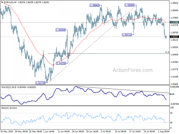 In the bigger picture, the rebound from 1.5271 was somewhat weaker than expected. EUR/AUD also failed to sustain above 55 day EMA and hints on some underlying bearishness. Though, for now, as long as 1.5271 support holds, medium term rise from 1.3624 (2017 low) is still mildly in favor to extend through 1.6189 high, to 1.6587 key resistance (2015 high). Nevertheless, firm break of 1.5271 will complete a head and shoulder top pattern (ls: 1.5770, h: 1.6189, rs: 1.5888). That would indicate medium term reversal and turn outlook bearish.