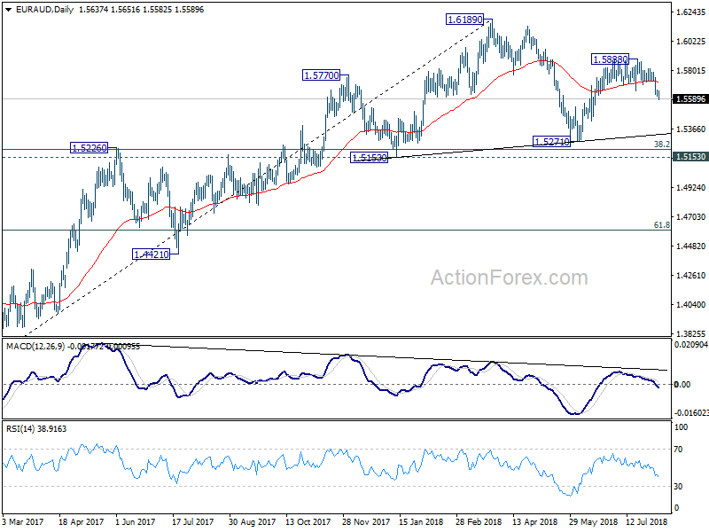 In the bigger picture, the rebound from 1.5271 was somewhat weaker than expected. EUR/AUD also failed to sustain above 55 day EMA and hints on some underlying bearishness. Though, for now, as long as 1.5271 support holds, medium term rise from 1.3624 (2017 low) is still mildly in favor to extend through 1.6189 high, to 1.6587 key resistance (2015 high). Nevertheless, firm break of 1.5271 will complete a head and shoulder top pattern (ls: 1.5770, h: 1.6189, rs: 1.5888). That would indicate medium term reversal and turn outlook bearish.
