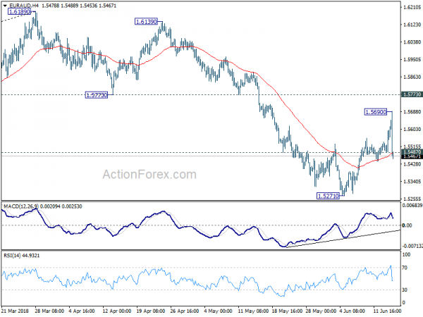 EUR/AUD’s rebound from 1.5271 extends further to as high as 1.5822 so far. The break of 1.5773 carries larger bullish implications. Intraday bias stays on the upside for 1.6189 high next. On the downside, break of 1.5617 support is needed to indicate completion of the rise from 1.5271. Otherwise, outlook will now remain cautiously bullish in case of retreat.