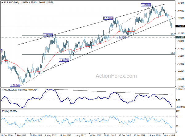 EUR/AUD’s steep fall and break of 1.5314 suggests resumption of recent decline from 1.6189. Intraday bias is back on the downside for 1.5153 key support level . On the upside, break of 1.5529 resistance is now needed to indicate short term bottoming. Otherwise, outlook will remain bearish in case of recovery.