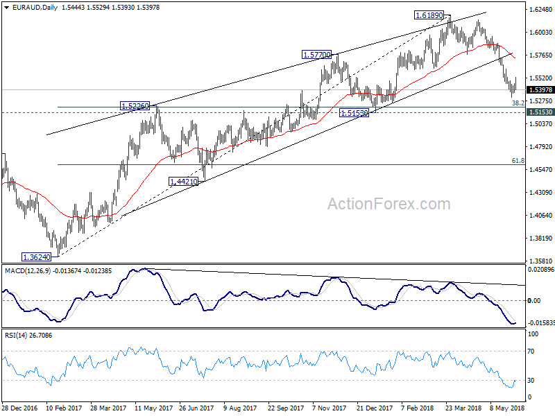 EUR/AUD’s steep fall and break of 1.5314 suggests resumption of recent decline from 1.6189. Intraday bias is back on the downside for 1.5153 key support level . On the upside, break of 1.5529 resistance is now needed to indicate short term bottoming. Otherwise, outlook will remain bearish in case of recovery.