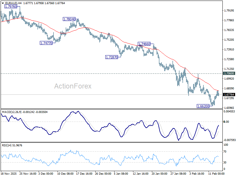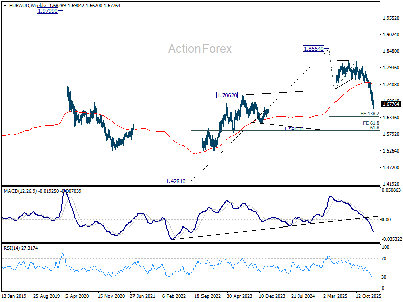 EUR/AUD's decline resumed last week and hit 1.6620, but recovered since then. Initial bias remains neutral this week for consolidations. Outlook will stay bearish as long as 1.7060 resistance holds. Break of 1.6620 will resume larger down trend from 1.8554 to 138.2% projection of 1.8554 to 1.7245 from 1.8160 at 1.6351 next. However, firm break of 1.7060 will indicate short term bottoming, and bring stronger rebound.
