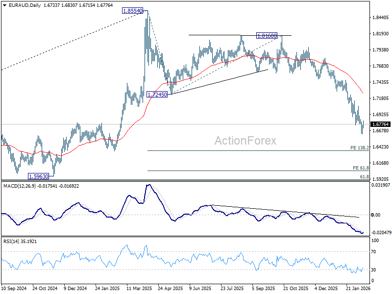 Intraday bias in EUR/AUD remains on the downside for the moment. Current fall is part of the whole down trend from 1.8554 and should target 138.2% projection of 1.8554 to 1.7245 from 1.8160 at 1.6351 next. For now, outlook will stay bearish as long as 1.7060 resistance holds, in case of recovery.