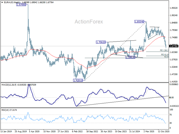 In the bigger picture, fall from 1.8554 medium term top is seen as reversing the whole up trend from 1.4281 (2022 low). Deeper decline should be seen to 61.8% retracement of 1.4281 to 1.8554 at 1.5913, which is slightly below 1.5963 structural support. For now, risk will stay on the downside as long as 1.7245 support turned resistance holds, even in case of strong rebound.