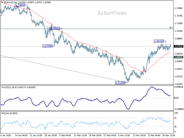 EUR/AUD edged higher to 1.6842 but quickly retreated. Intraday bias remains neutral first. On the upside, above 1.6842 will extend the rebound from 1.6125 to 38.2% retracement of 1.8554 to 1.6125 at 1.7053. However, break of 1.6561 minor support will argue that the rebound has completed, after rejection by 55 D EMA (now at 1.6754). Retest of 1.6125 low should be seen next.