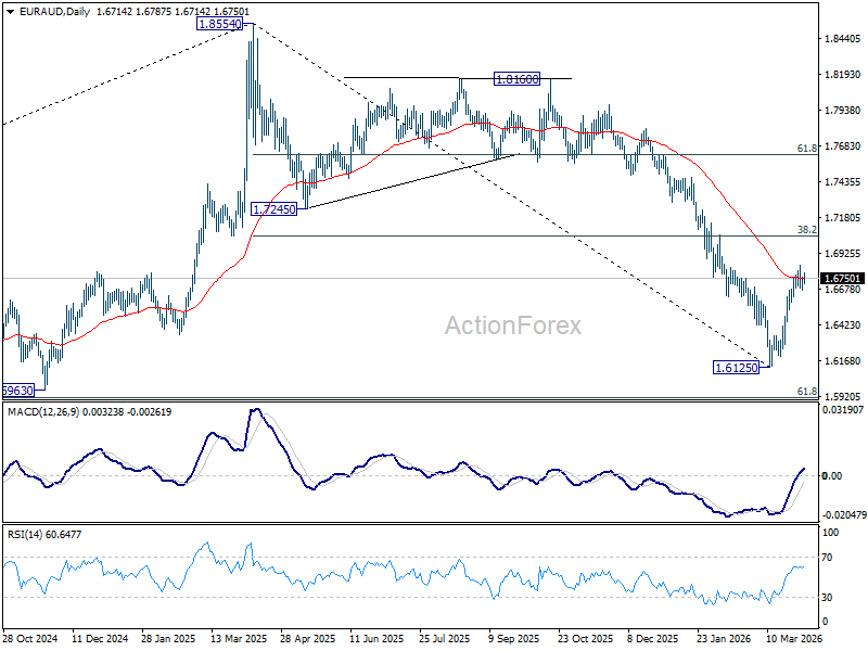 Intraday bias in EUR/AUD is turned neutral first with current retreat. On the upside, above 1.6803 will extend the rebound from 1.6125 to 38.2% retracement of 1.8554 to 1.6125 at 1.7053. However, break of 1.6561 minor support will argue that the rebound has completed, after rejection by 55 D EMA (now at 1.6754). Retest of 1.6125 low should be seen next.