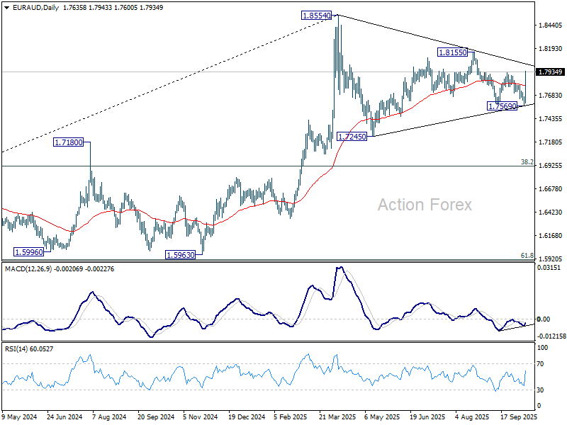 EUR/AUD’s rally continues today and intraday bias stays on the upside for 1.8155 resistance. Firm break there will argue that whole corrective pattern from 1.8554 has completed with three waves to 1.7569. Further rise should be seen to retest 1.8554 high next. On the downside, below 1.79743 will turn intraday bias neutral first.