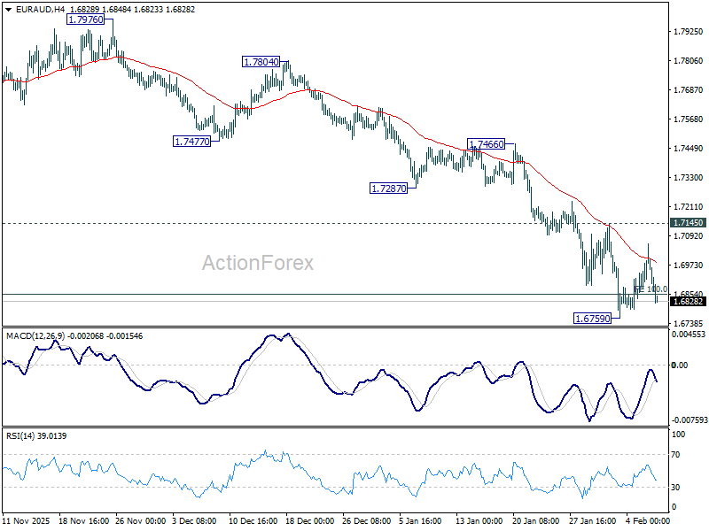 EUR/AUD's fall is resuming by breaking 1.6759 support. Intraday bias is back on the downside. Next target is 138.2% projection of 1.8554 to 1.7245 from 1.8160 at 1.6351. On the upside, however, break of 1.7060 resistance will indicate short term bottoming, and turn bias back to the upside for stronger rebound.