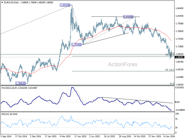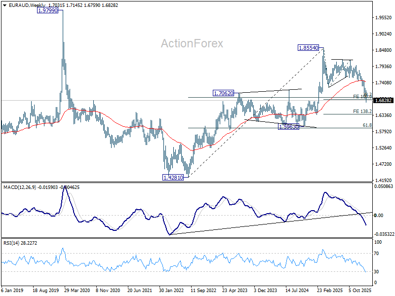 Intraday bias in EUR/AUD remains on the downside for the moment. Current fall is part of the whole down trend from 1.8554 and should target 138.2% projection of 1.8554 to 1.7245 from 1.8160 at 1.6351 next. For now, outlook will stay bearish as long as 1.7060 resistance holds, in case of recovery.