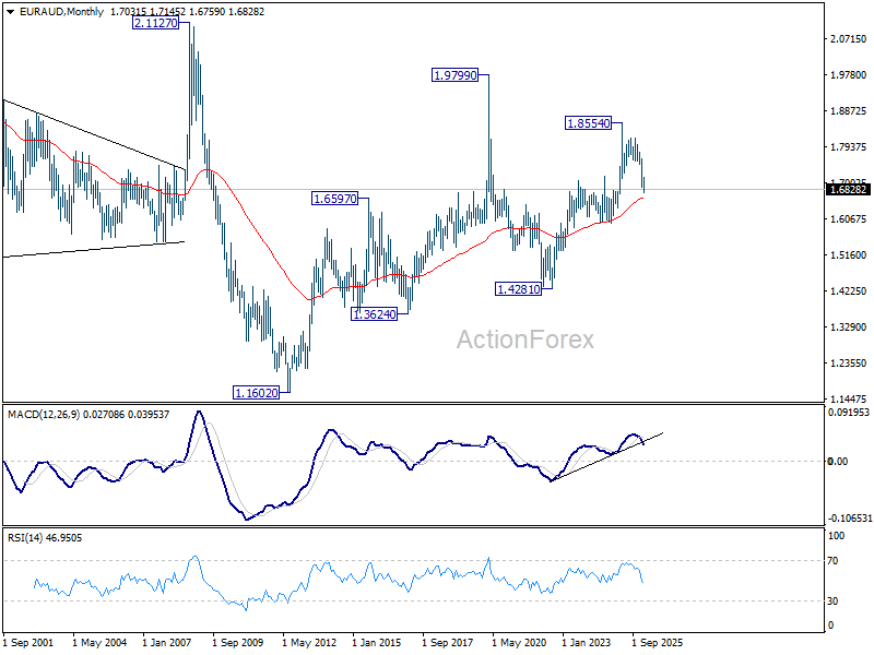 In the bigger picture, fall from 1.8554 medium term top is seen as reversing the whole up trend from 1.4281 (2022 low). Deeper decline should be seen to 61.8% retracement of 1.4281 to 1.8554 at 1.5913, which is slightly below 1.5963 structural support. For now, risk will stay on the downside as long as 1.7245 support turned resistance holds even in case of strong rebound.