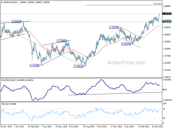 EUR/AUD’s up trend resumed last week and surged to as high as 1.6783. But as a temporary top was formed there. Initial bias remains neutral for consolidations. Downside of retreat should be contained by 1.6444 resistance turned support to bring rally resumption. On the upside, break of 1.6785 will resume larger up trend from 1.4281 to 100% projection of 1.4281 to 1.5976 from 1.5254 at 1.6949.