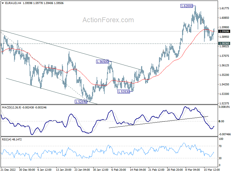 EUR/AUD recovers after drawing support from 1.6053 and intraday bias remains neutral first. Focus stays on 0.6389/6434 cluster resistance zone. Decisive break there will carry larger bullish implications. However, firm break of 1.6053 will confirm short term topping, after rejection by the mentioned resistance. Intraday bias will be turned back to the downside for 1.5848 support and possibly below.