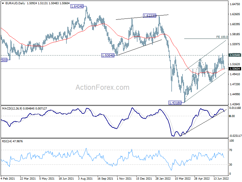 Intraday bias in EUR/AUD remains neutral and outlook is unchanged. Further decline is in favor with 1.5043 resistance intact. On the downside, decisive break of 1.4759 support should confirm that corrective rise from 1.4318 has completed at 1.5396 after rejection by 1.5354 support turned resistance. Deeper fall should then be seen back to retest 1.4318 low. On the upside, however, break of 1.5043 will bring stronger rebound back towards 1.5396.