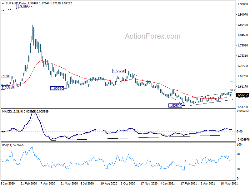 Intraday bias in EUR/AUD remains neutral for the moment. On the downside, break of 1.5657 will target 1.5418 support. Firm break there will confirm that consolidation pattern from 1.5250 has completed just missing 38.2% retracement of 1.6827 to 1.5250 at 1.5852. On the upside, however, sustained break of 1.5852 will bring further rally back to 1.6033 support turned resistance.