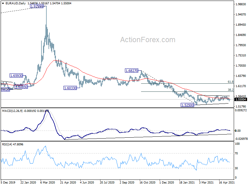 Intraday bias in EUR/AUD remains neutral for the moment. Price actions from 1.5250 are seen as a consolidation pattern. Upside should be limited by 38.2% retracement of 1.6827 to 1.5250 at 1.5852 to bring down trend resumption. However, sustained break of 1.5852 will bring further rally back to 1.6033 support turned resistance.