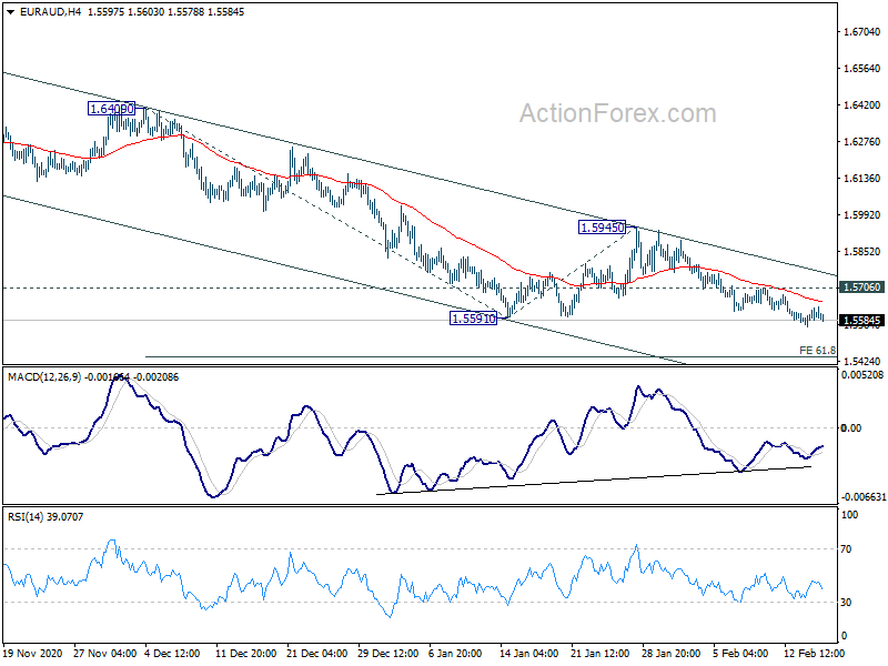 With 1.5634 minor resistance intact, further decline is expected in EUR/AUD to 61.8% projection of 1.6409 to 1.5591 from 1.5945 at 1.5439. Firm break there will target 100% projection at 1.5127. On the upside, break of 1.5634 minor resistance will turn bias neutral and bring consolidations first. But outlook will stay bearish as long as 1.5945 resistance holds.