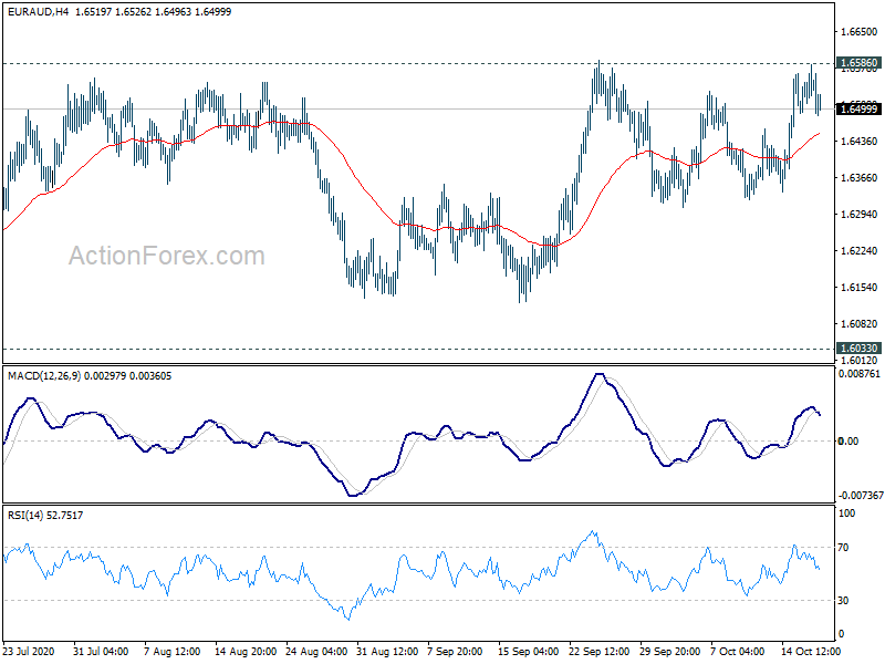 EUR/AUD rises further to as high as 1.6609 so far today. The break of 1.6586 resistance now suggests that it’s at least in correction to fall from 1.9799 to 1.6033. Intraday bias is now on the upside for 38.2% retracement of 1.9799 to 1.6033 at 1.7472. On the downside, though, break of 1.6485 support will dampen this bullish case and turn intraday bias neutral first.